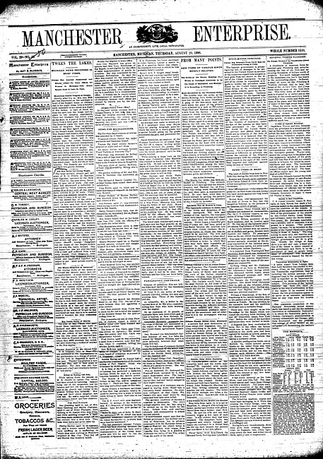 Text (1896)Part of Making of Modern MichiganManchester enterprise. Vol. 29 no. 51 (1896 August 27)