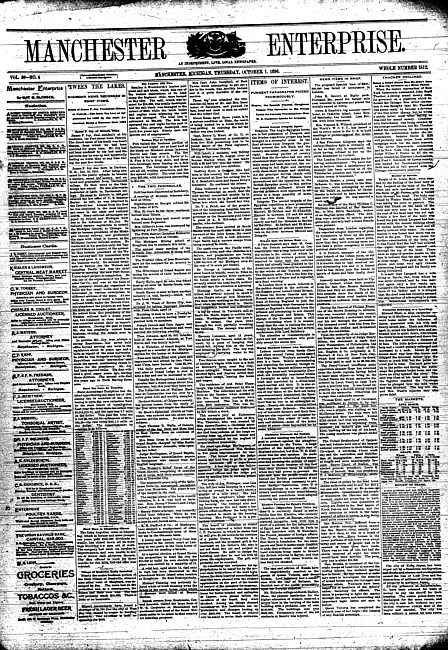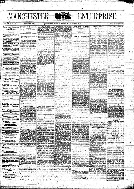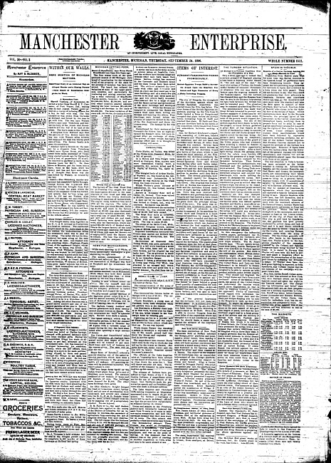 Text (1896)Part of Making of Modern MichiganManchester enterprise. Vol. 30 no. 3 (1896 September 24)