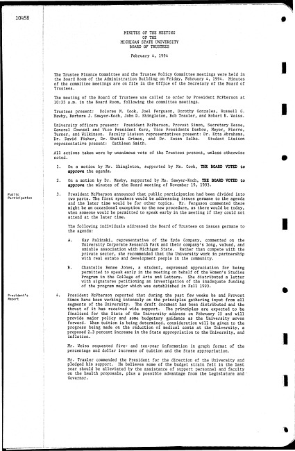 Meeting minutes, February 04, 1994