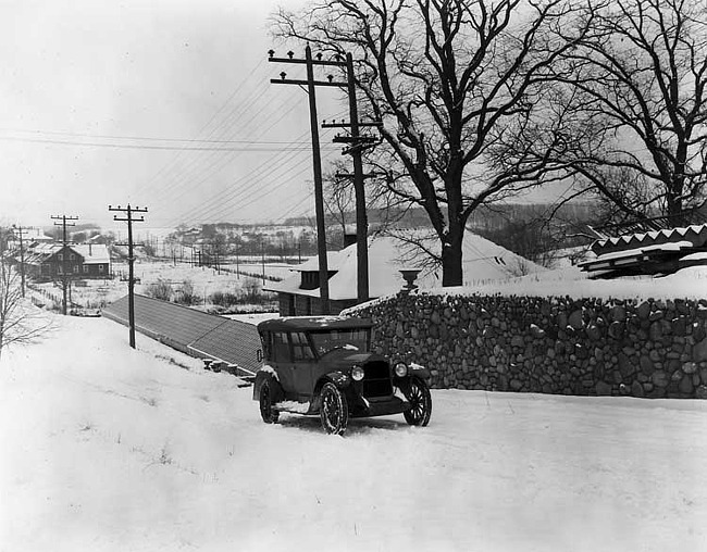 Still Image (1929)Part of Making of Modern Michigan1920-1921 Packard touring car driving up a snowy hill by stone wall