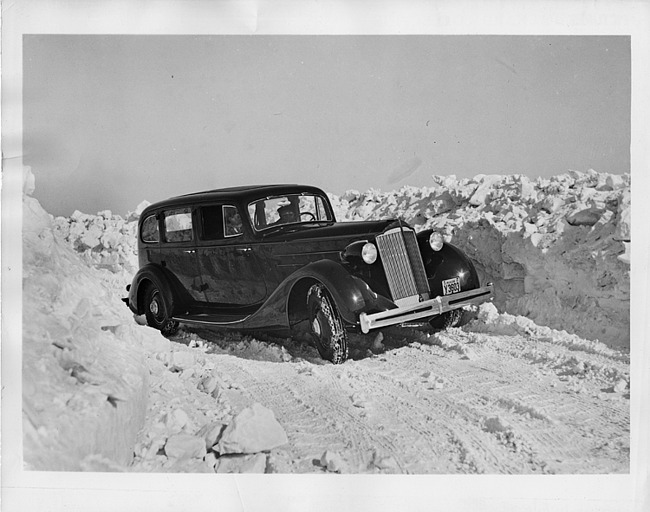 1912 Packard 30 fore-door limousine with tire chains on snow