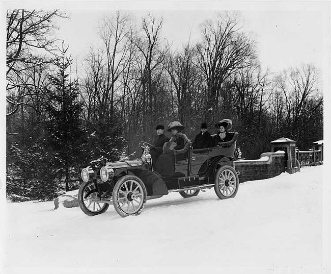 Still Image (1909)Part of Making of Modern Michigan1909 Packard 30 Model UB touring car, with two couples on winter road