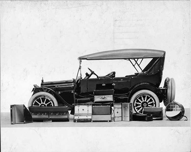 Still Image (1916)Part of Making of Modern Michigan1916 Packard 1-25 touring car, left side, top raised, with several travel trunks
