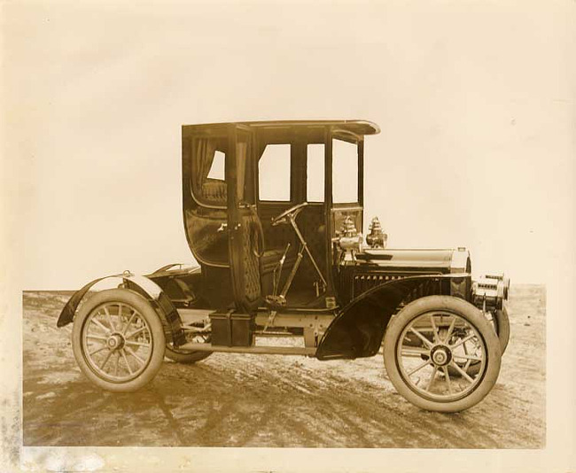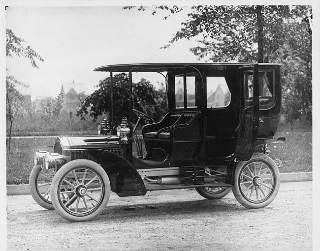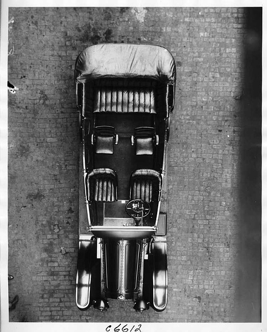 1917 Packard parked on street, view from above, showing seating and steering wheel