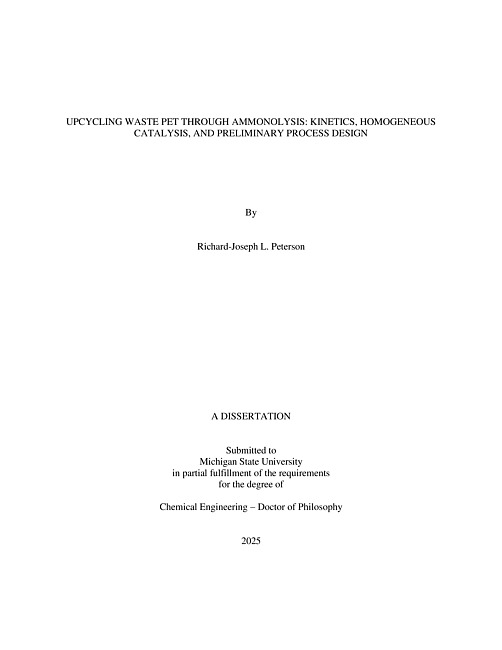 UPCYCLING WASTE PET THROUGH AMMONOLYSIS : KINETICS, HOMOGENEOUS CATALYSIS, AND PRELIMINARY PROCESS DESIGN
