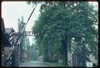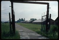 Auschwitz Concentration Camp : View of entry gate and barracks blocks along road