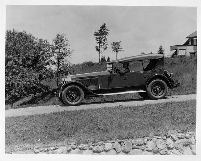 1925-1926 Packard touring sedan on country road, top raised, side curtains in place