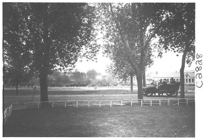 E.M.F. car parked on side of road, men on horses in background, on pathfinder tour for 1909 Glidden Tour