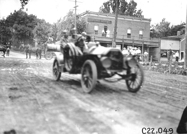 Moline car passes the Oxford Hotel in Missouri Valley, Iowa at 1909 Glidden Tour