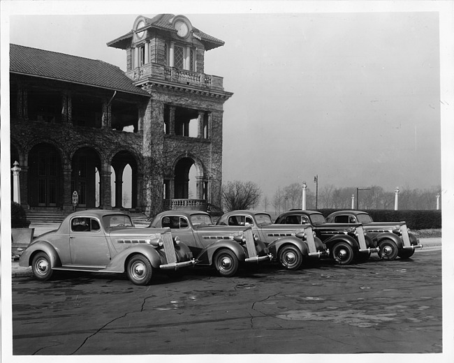 Still Image (1952)Part of Making of Modern Michigan1937 Packard business coupes, lined up in front of Belle Isle Casino
