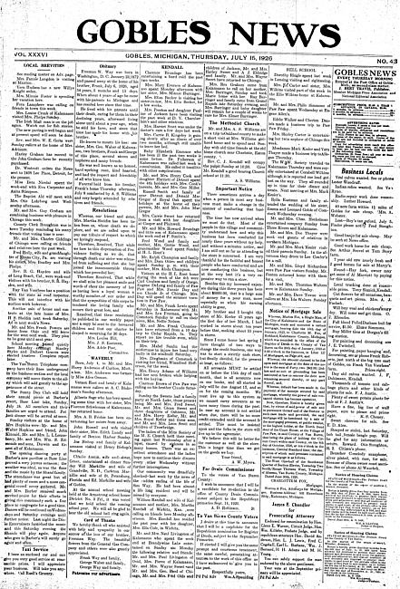 Gobles news. Vol. 36 no. 43 (1926 July 15)