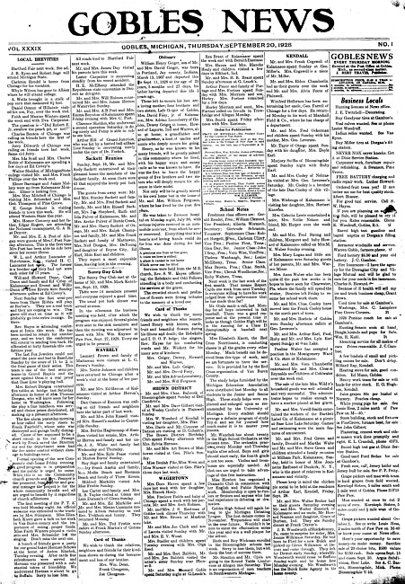 Gobles news. Vol. 39 no. 1 (1928 September 20)