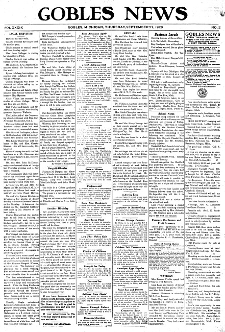 Gobles news. Vol. 39 no. 2 (1928 September 27)