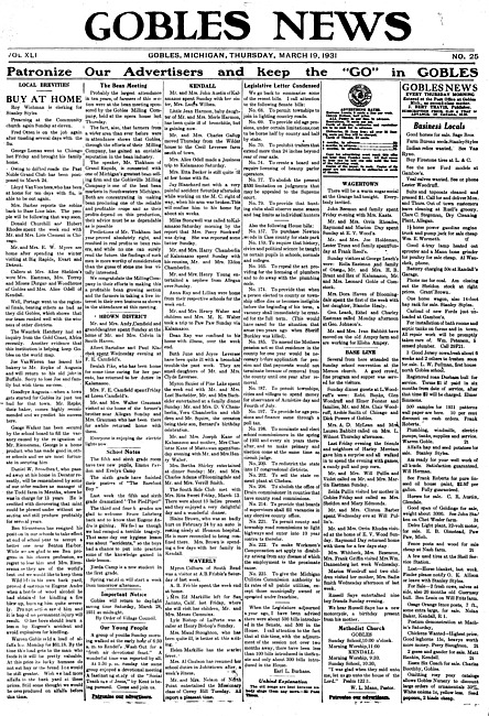 Gobles news. Vol. 41 no. 25 (1931 March 19)