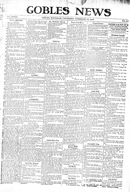 Gobles news. Vol. 36 no. 22 (1926 February 18)