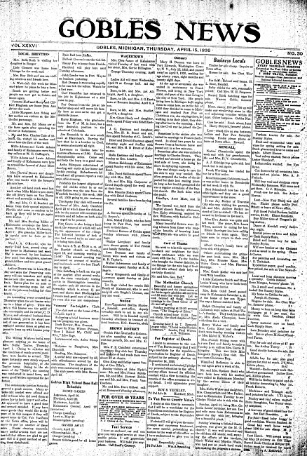Gobles news. Vol. 36 no. 30 (1926 April 15)
