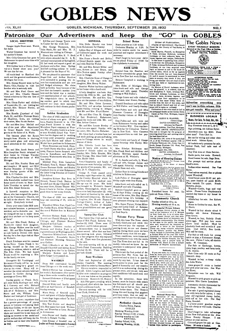 Gobles news. Vol. 43 no. 1 (1932 September 29)