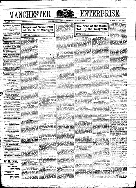Text (1904)Part of Making of Modern MichiganManchester enterprise. Vol. 35 no. 22 (1902 January 30)