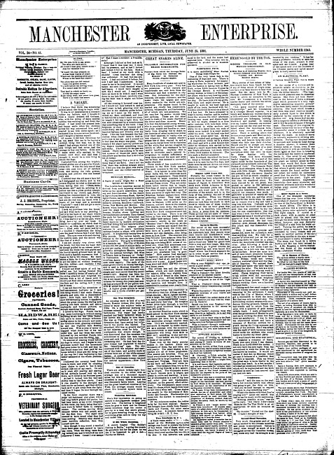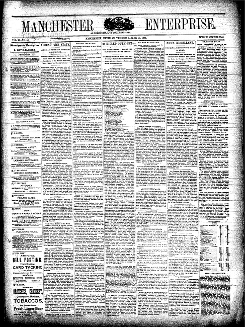Text (1894)Part of Making of Modern MichiganManchester enterprise. Vol. 22 no. 20 (1889 January 24)