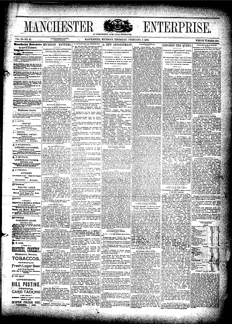 Text (1885)Part of Making of Modern MichiganManchester enterprise. Vol. 21 no. 21 (1888 February 2)