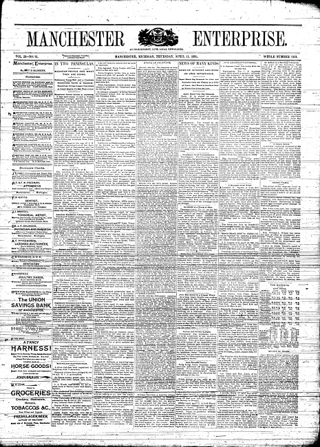 - Manchester enterprise. Vol. 18 no. 20 (1885 January 29)Text (1885)Part of Making of Modern Michigan