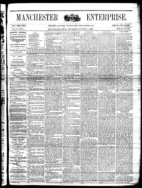 Text (1880)Part of Making of Modern MichiganManchester enterprise. Vol. 14 no. 2 (1880 September 30)