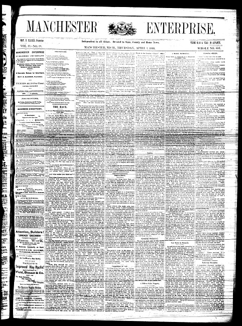 Text (1884)Part of Making of Modern MichiganManchester enterprise. Vol. 13 no. 4 (1879 October 16)