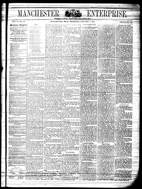 Text (1882)Part of Making of Modern MichiganManchester enterprise. Vol. 15 no. 18 (1882 January 19)