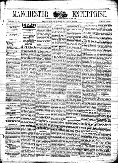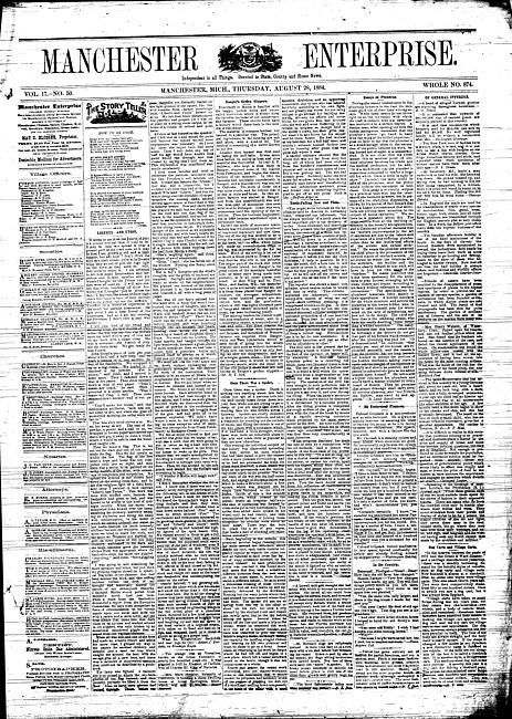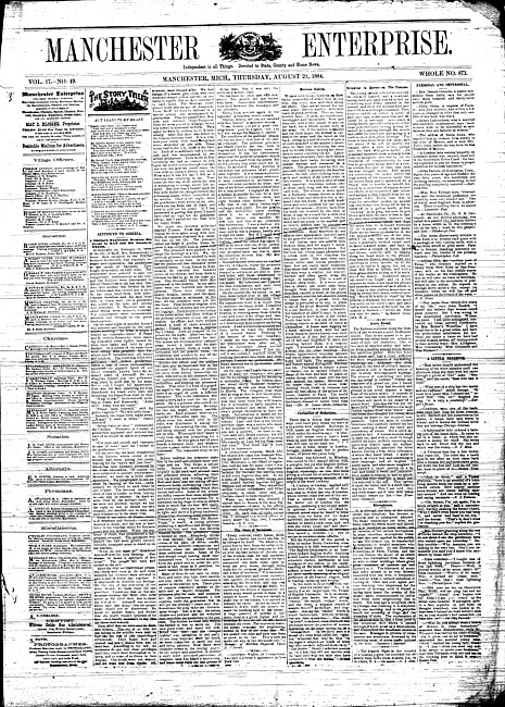 Text (1884)Part of Making of Modern MichiganManchester enterprise. Vol. 17 no. 50 (1884 August 28)
