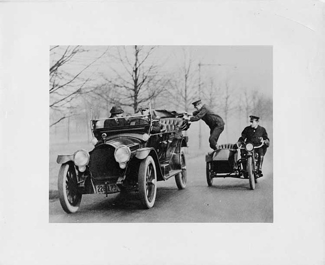 1916 Packard 1-25 phaeton, driving alongside a motorcycle and sidecar with two policemen