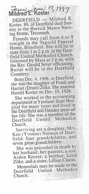 Surname index to newspaper clippings regarding the Milan Michigan area. Approx. dates 1885/1991, Page 023