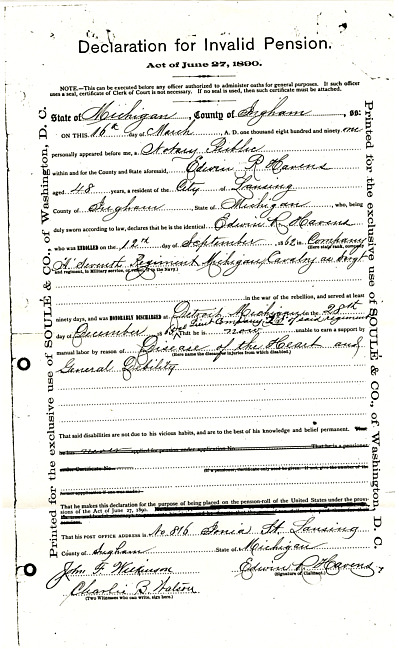 Simeon A. Howe Declaration For Original Invalid Pension : July 12, 1890
