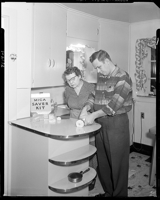 Man demonstrating counter top product to woman in kitchen
