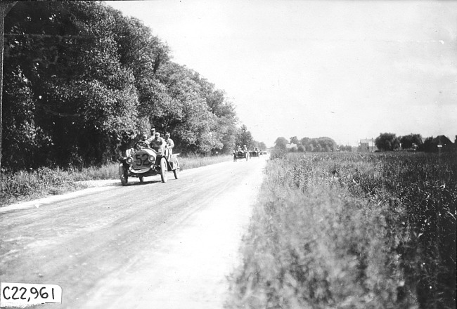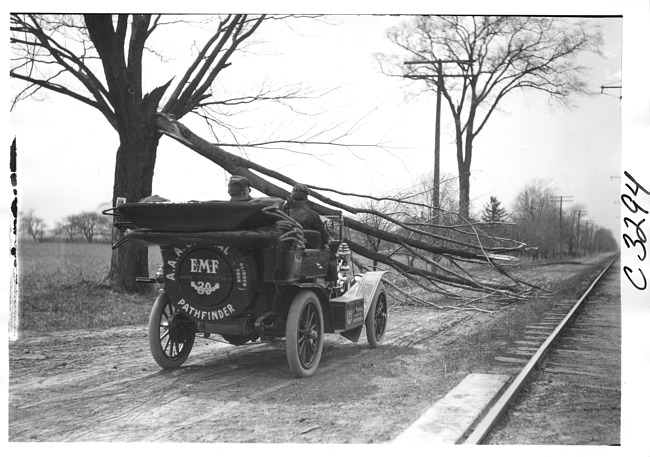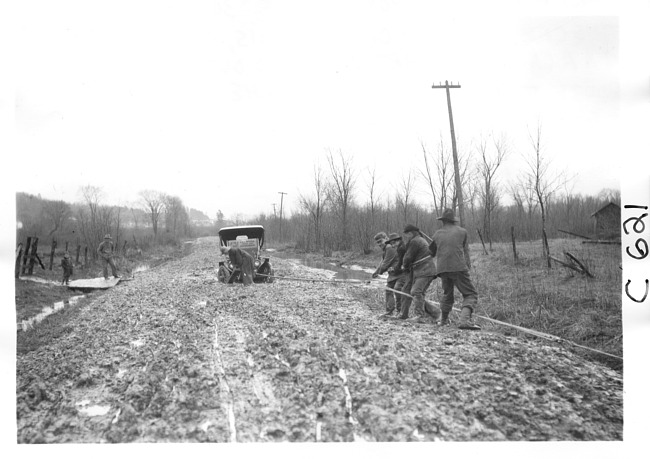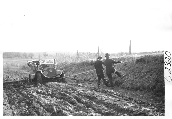 E.M.F. car being pulled from mud, on pathfinder tour for 1909 Glidden Tour