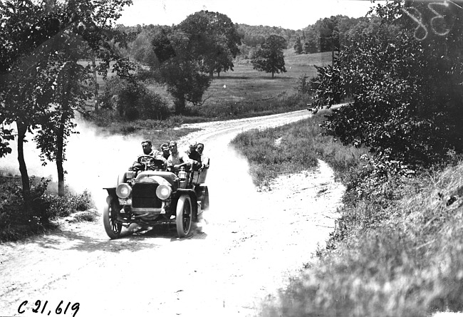 Smithson in Studebaker car on rural road, at 1909 Glidden Tour