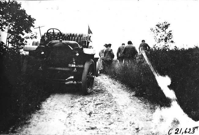 Still Image (1909)Part of Making of Modern MichiganStudebaker press car off the road after breaking a wheel at 1909 Glidden Tour