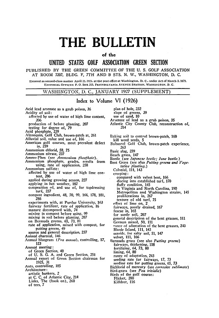 The bulletin of the United States Golf Association Green Section. Vol. 6, Index (1927 January)