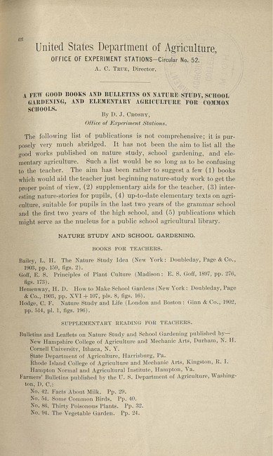 A few good books and bulletins on nature study, school gardening, and elementary agriculture for common schools
