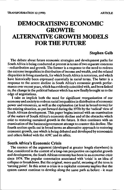 After critically considering the different positions on models for economic growth in South Africa being urgently debated at the moment, the author argues that dynamic development and greater equality need to be pursued as part of the same process and incorporated into a new kind of model.