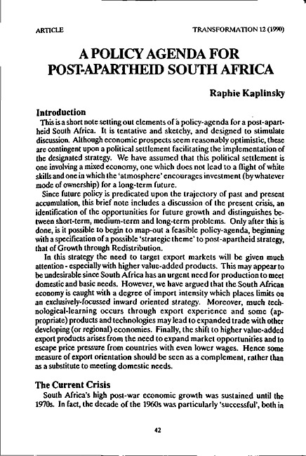 Developing economic policy for the transition to a post-apartheid society will not be easy, argues the author. A critical grasp of existing forces in the economy and awareness of what is possible in the world conjuncture may yield a path of growth through redistribution.