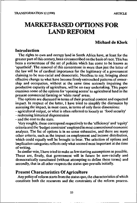 The author assumes that the land question in South Africa can and must be resolved through reform that rigorously considers market constraints and production needs while assisting black small farmers.