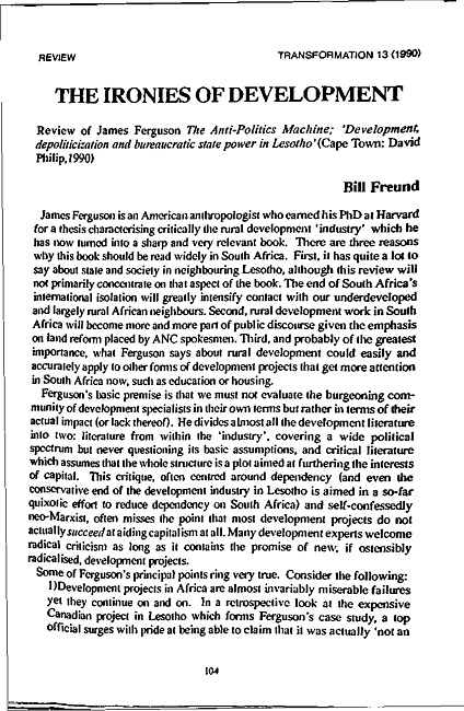 Review of: James Ferguson. The anti-politics machine. Cape Town: David Philip, 1990