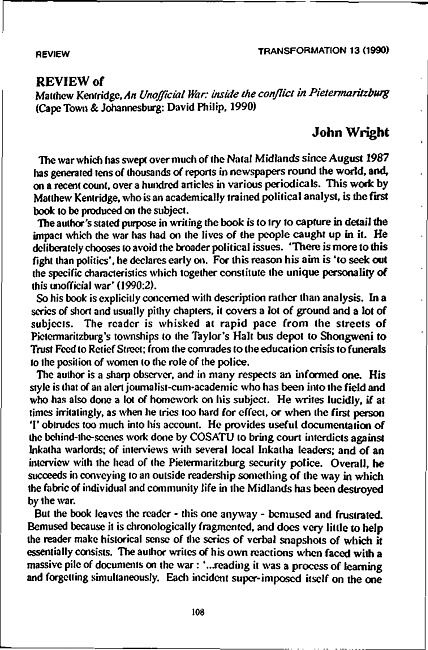 Review of: Matthew Kentridge. An unofficial war. Cape Town: David Philip, 1990