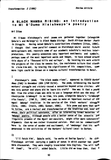 A black Mamba rising : an introduction to Mi S'dumo Hlatshwayo's poetry