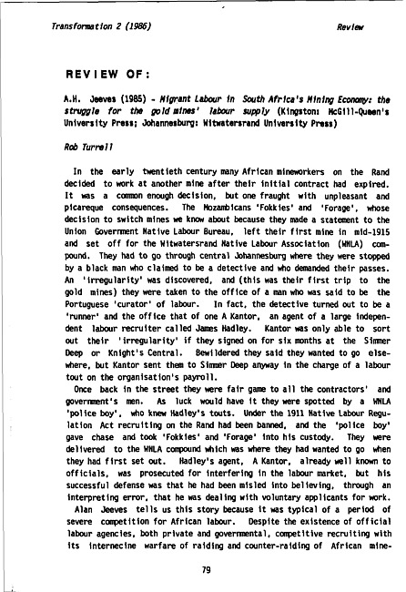 Review of: Alan H. Jeeves. Migrant labour in South Africa's mining economy. Kingston: McGill-Queen's University Press, 1985