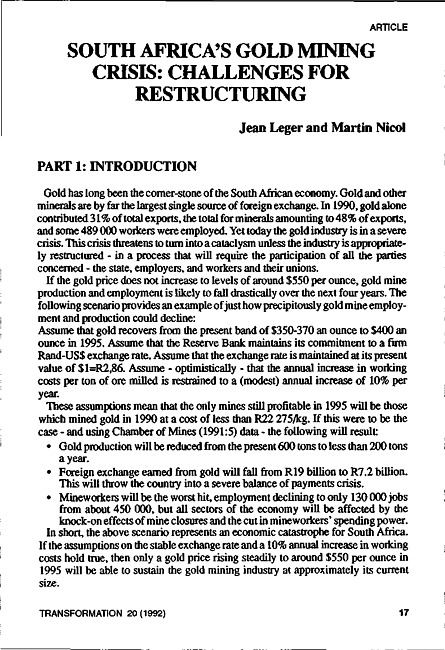 Gold has been the engine of South African economic growth since its discovery. Today, however, the industry faces a problematic future. The authors critique plans for restructuring the industry and suggest a more progressive route.