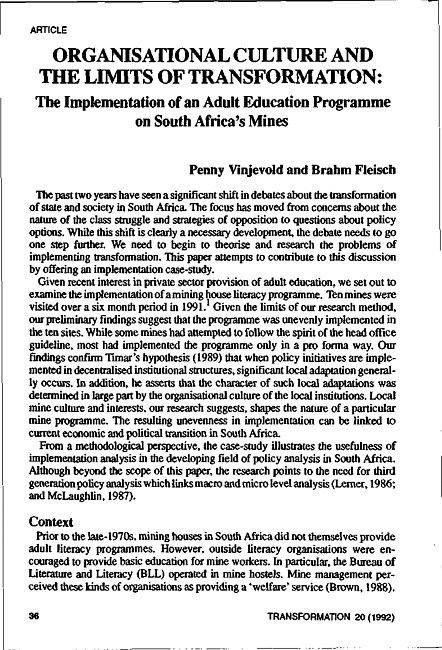 Organisational culture and the limits of transformation : the implementation of an adult education prgoramme on South Africa's mines