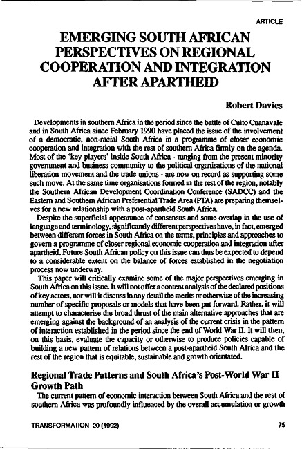 Under the surface, the author detects conflicting options in what sort of regional economic policy South Africa could adopt in a new political context. He contrasts those that might bring short-term gains in exploiting the vulnerabilities of South Africa's neighbours with others that might create an overall favourable development.