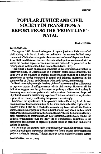 The people's court phenomenon raises the question in South Africa of revolutionary justice, of the relation between law and democracy. The author considers its potential in the transition phase in South Africa through some examples in one region.