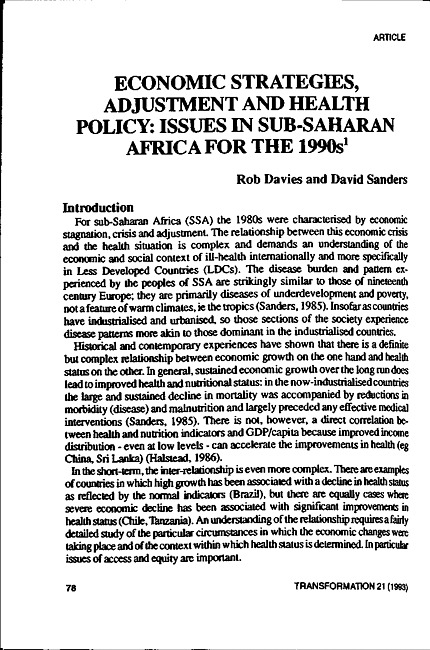 Economic strategies, adjustment and health policy : issues in sub-Saharan Africa for the 1990s